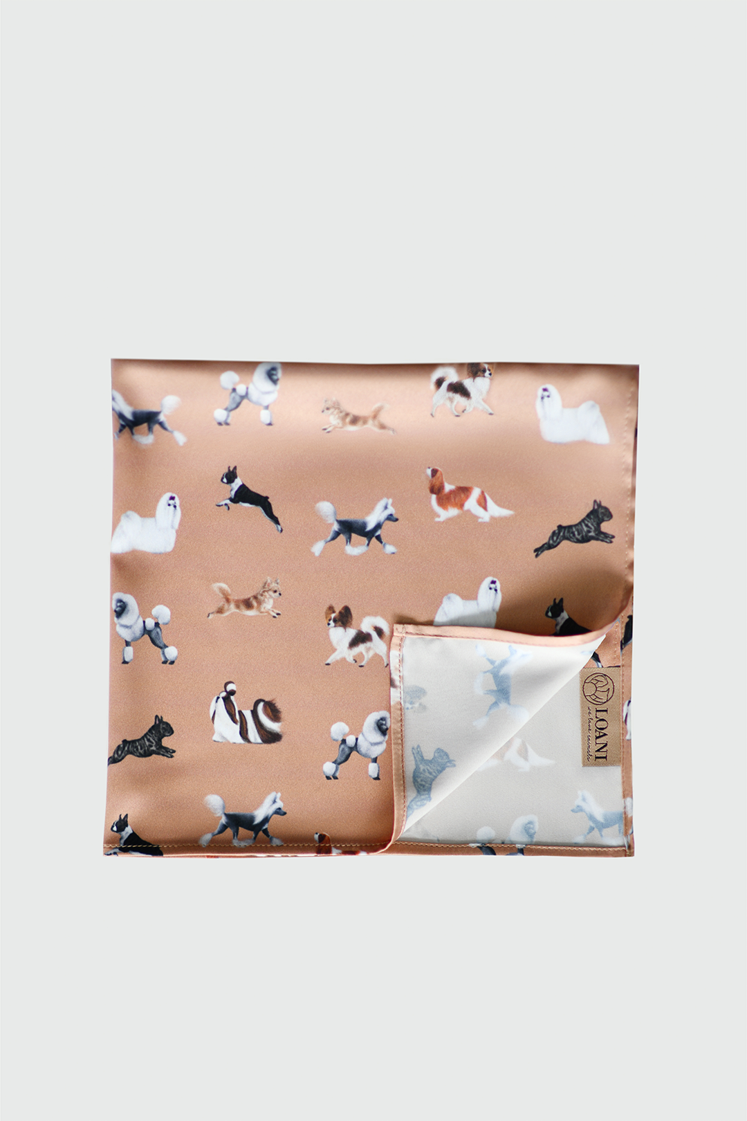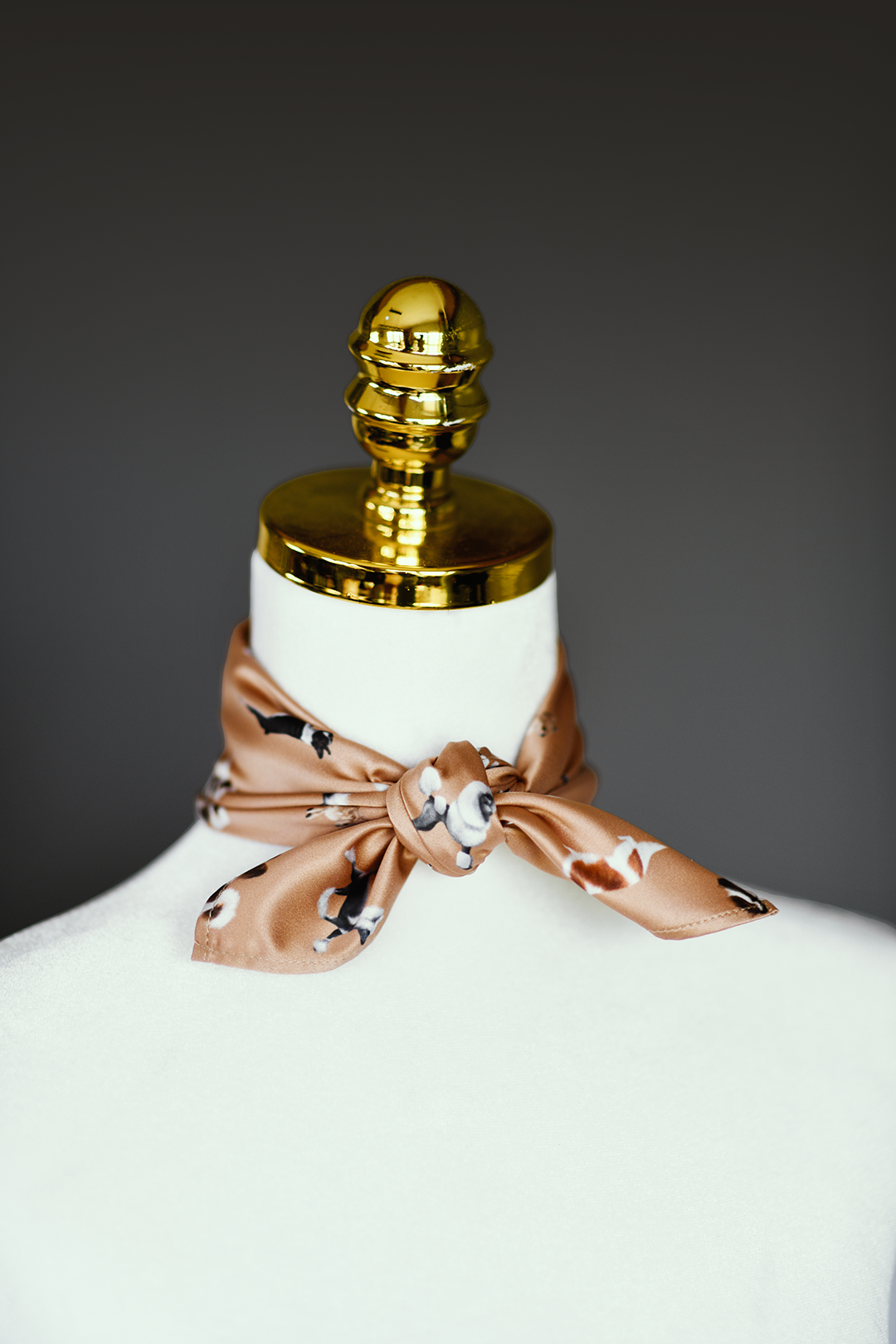 Karmelowa apaszka satynowa 45x45 cm z autorskim wzorem w Psy ozdobne i do towarzystwa. Elegancki i uniwersalny dodatek – do noszenia na szyi, nadgarstku lub przy torebce. Edycja limitowana.