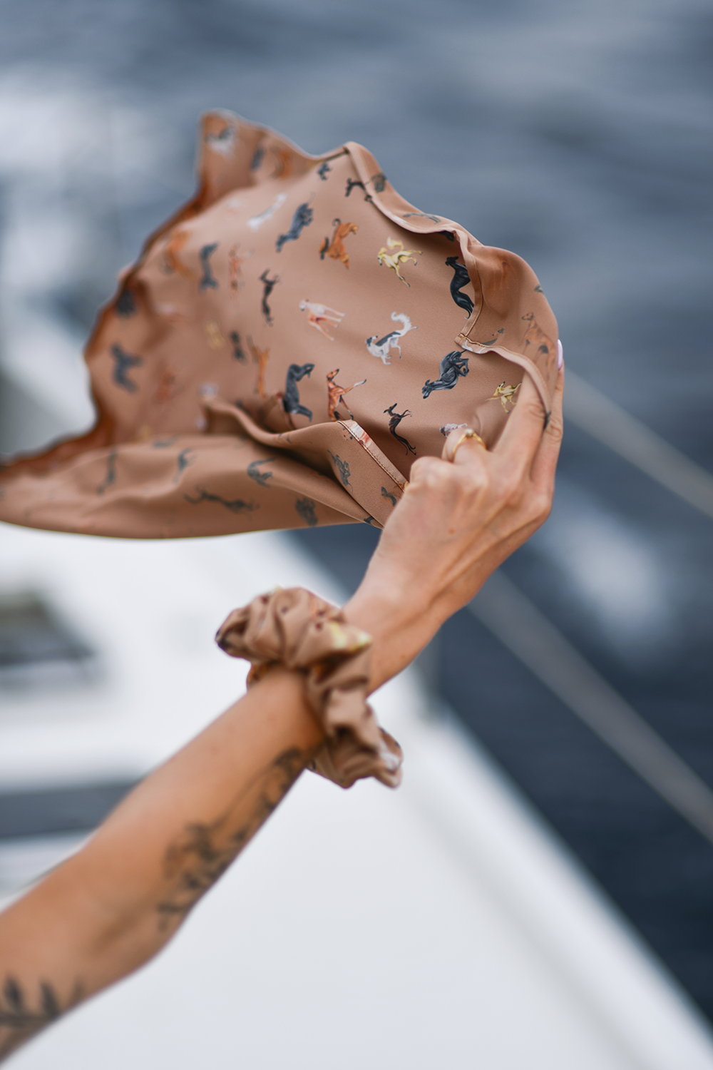 Karmelowa apaszka satynowa 45x45 cm z autorskim wzorem w charty. Elegancki i uniwersalny dodatek – do noszenia na szyi, nadgarstku lub jako poszetka. Made in Poland.