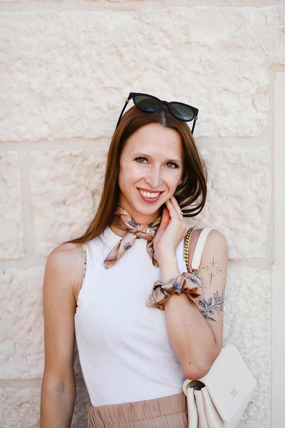 Apaszka została wykonana z miękkiej satyny, która pięknie układa się i subtelnie połyskuje. Wymiary 45x45 cm sprawiają, że jest niezwykle łatwa w wiązaniu – możesz ją zawiązać na szyi, nosić jako ozdobę na nadgarstku, dodać do torebki albo wykorzystać jako poszetkę do marynarki. To apaszka o bardzo klasycznych wymiarach.