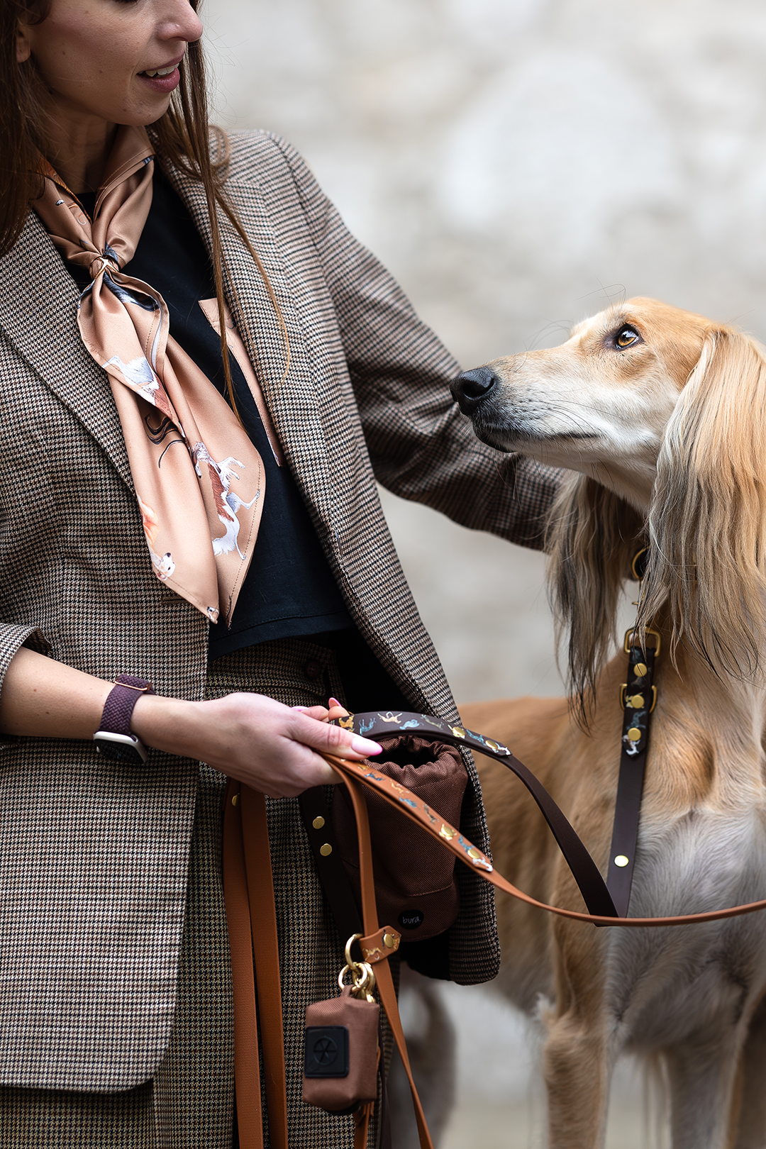 Każdy sposób noszenia tej apaszki podkreśli Twoją unikalną osobowość. Wzór w charty, ręcznie projektowany przez naszą artystkę, to hołd dla miłośników psów, którzy szukają elegancji i pasji w jednym.