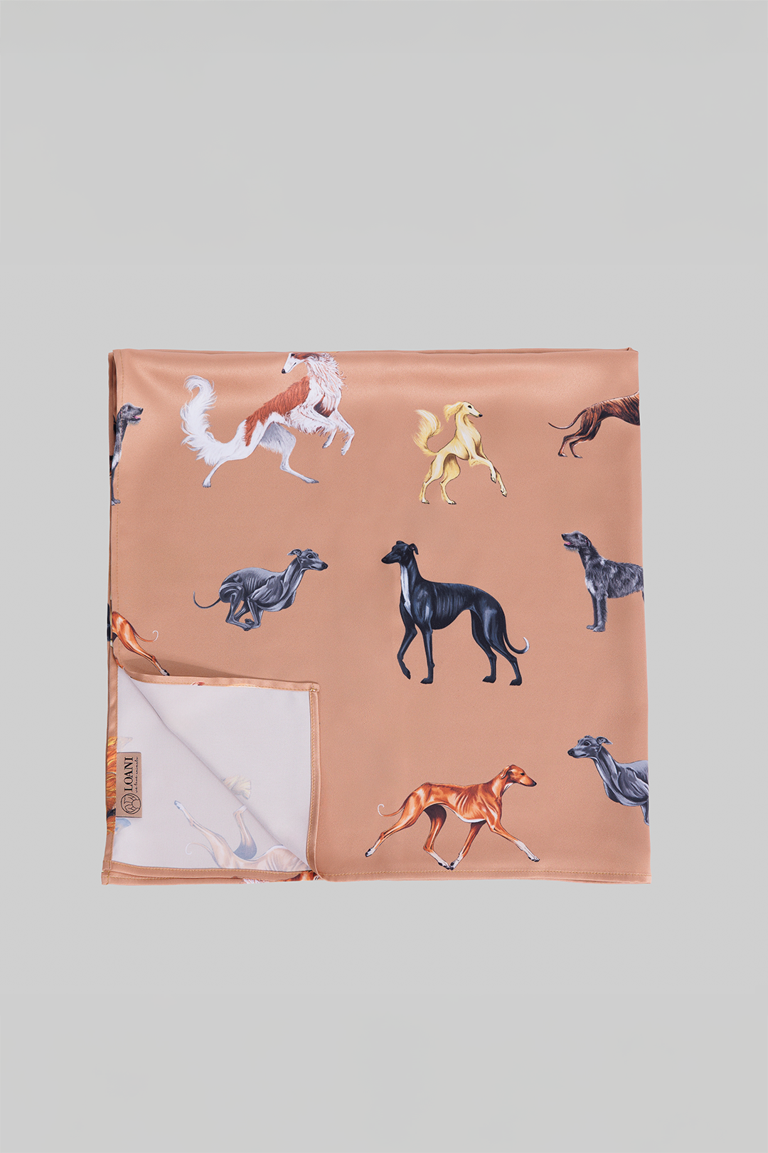 Stylowa apaszka z autorskim wzorem chartów. Karmelowa satyna dodaje świeżości każdej stylizacji. Noś ją na wiele sposobów!
