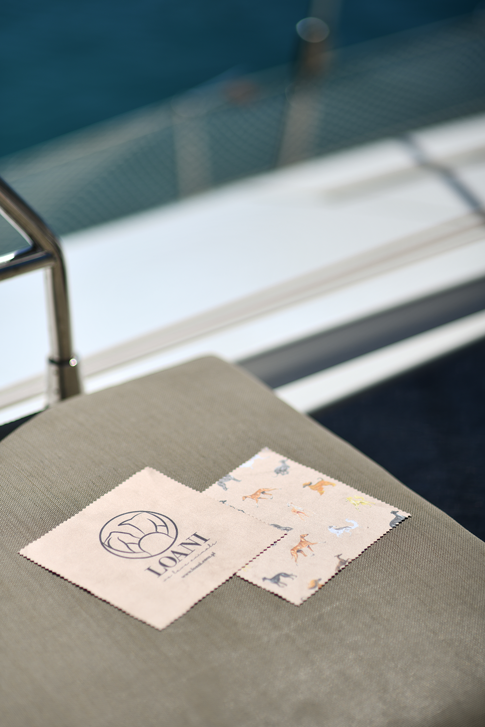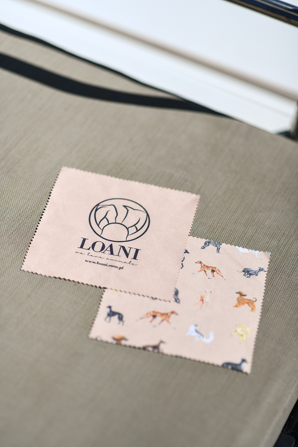 To, co wyróżnia chusteczkę LOANI, to unikatowy design – na jednej stronie znajduje się autorski wzór w charty, a na drugiej eleganckie logo marki. Dzięki temu chusteczka łączy funkcjonalność z artystycznym charakterem i świetnie sprawdzi się także jako drobny prezent.