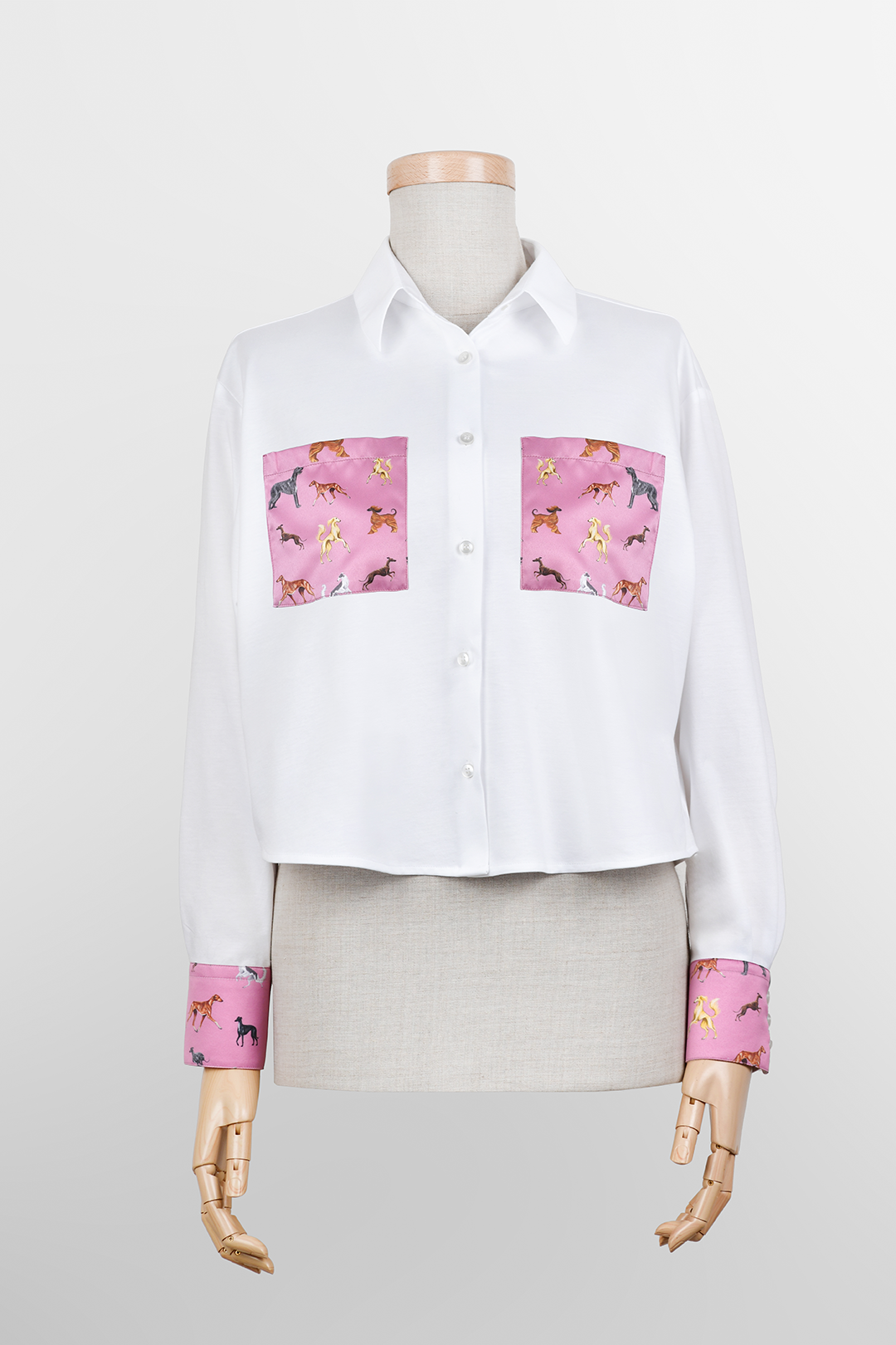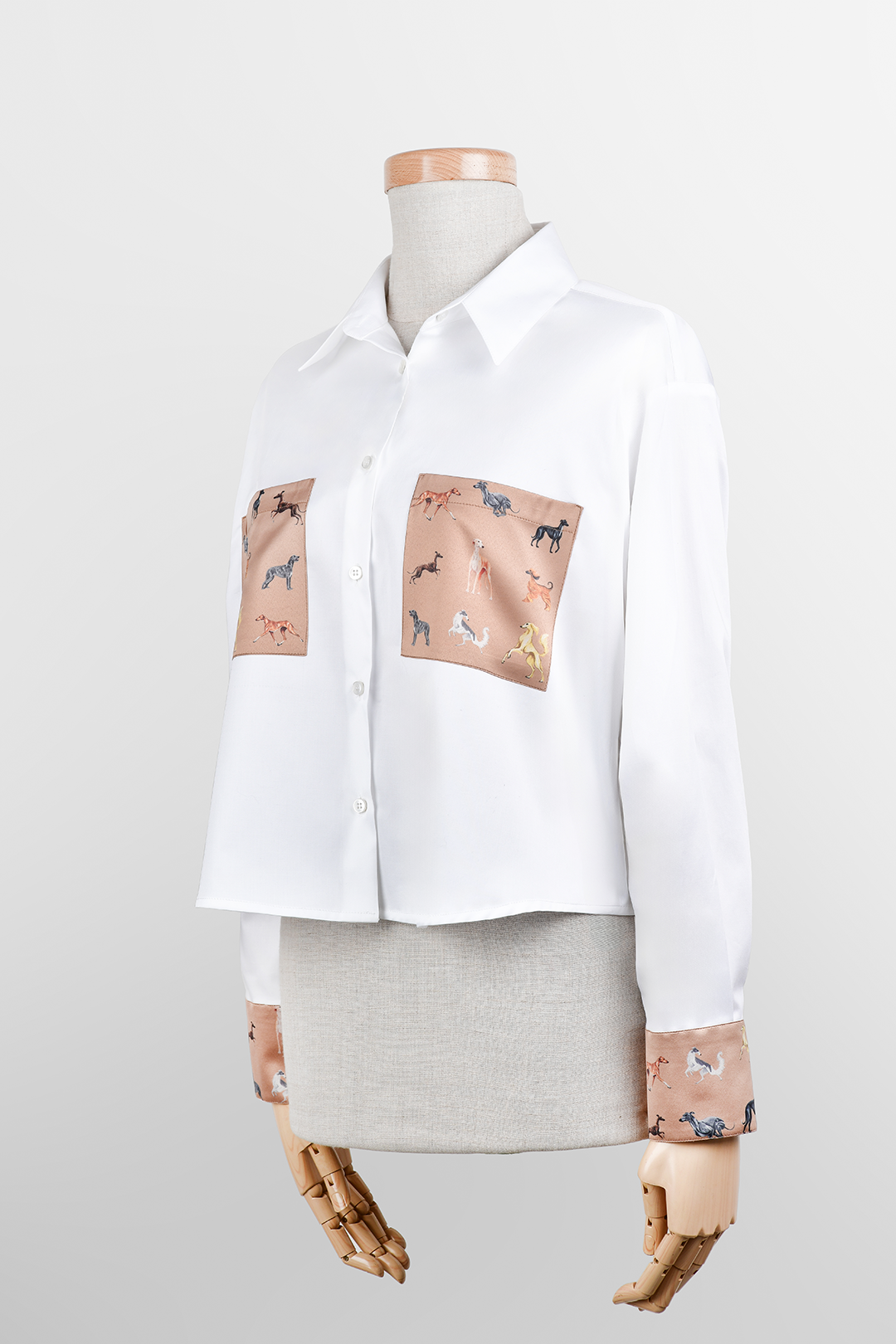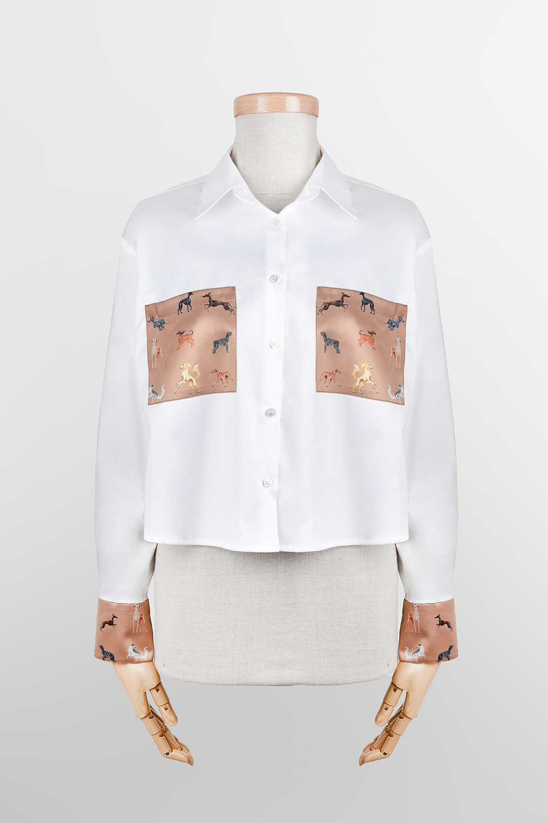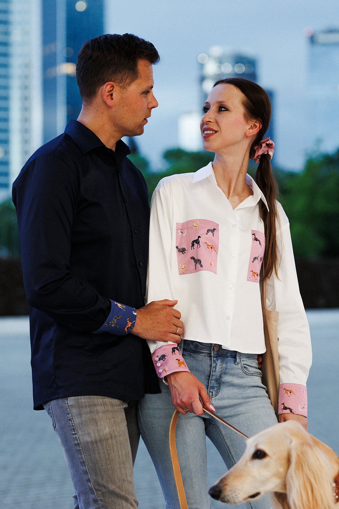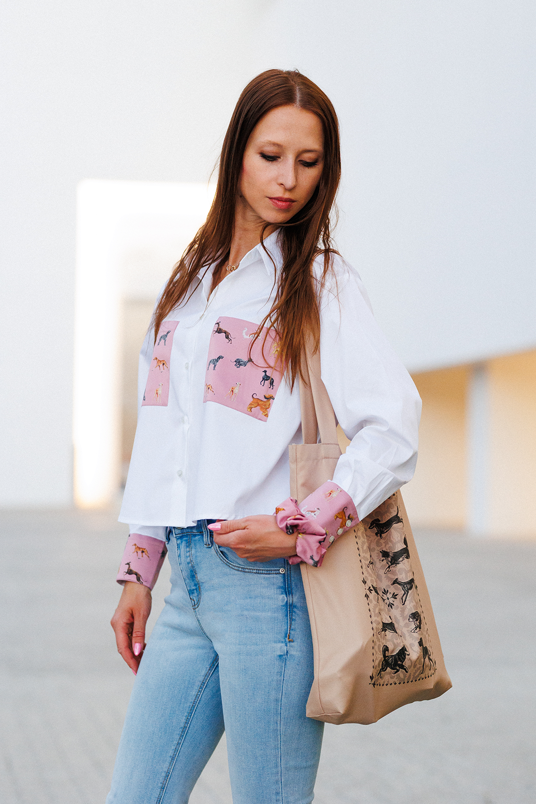 Subtelna, biała koszula z różowymi lub karmelowymi detalami i artystycznym wzorem chartów. Idealna do pracy i na co dzień.