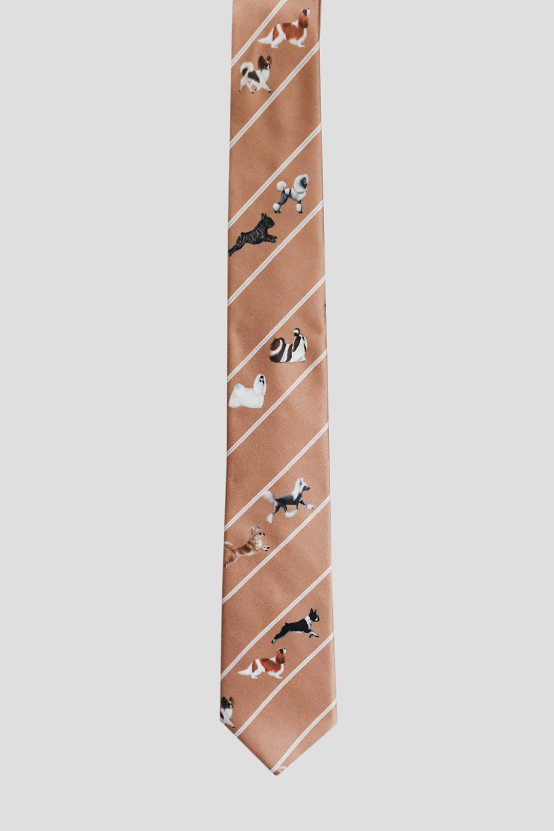 Elegancki krawat w kolorze karmelu, ze wzorem w Psy ozdobne i do towarzystwa. To wyjątkowe połączenie klasyki z autorskim wzornictwem. Zachwyca subtelnym połyskiem oraz przyjemnym w dotyku wykończeniem. Charakterystyczny wzór z małymi psami został ręcznie narysowany i przeniesiony na tkaninę.