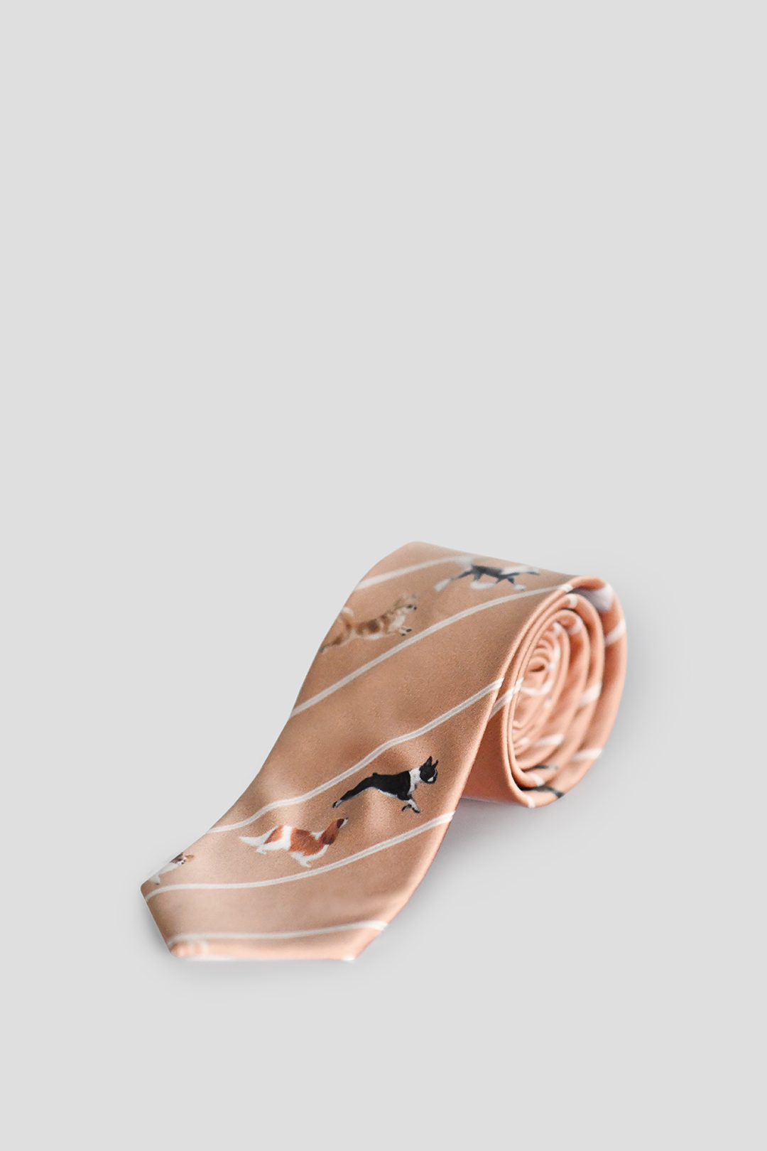 Karmelowy krawat z autorskim wzorem małych psów, szyty w Polsce. Stylowy, elegancki i oryginalny – idealny na prezent lub ważne okazje.