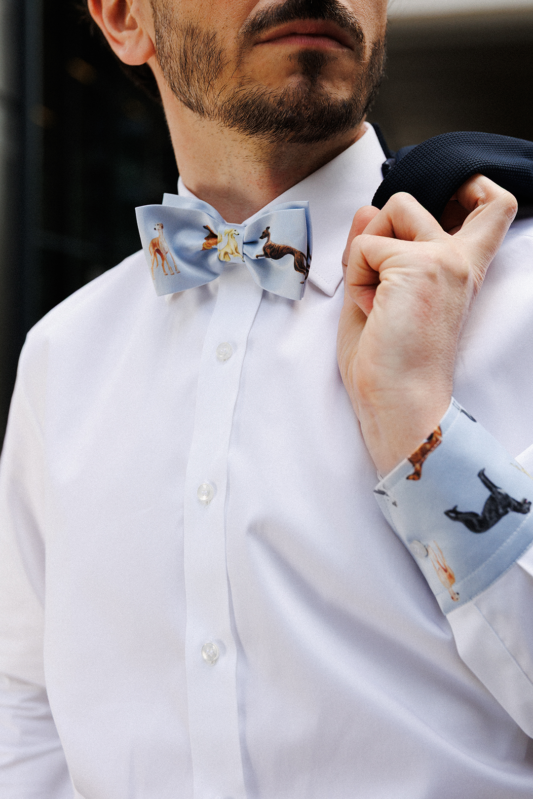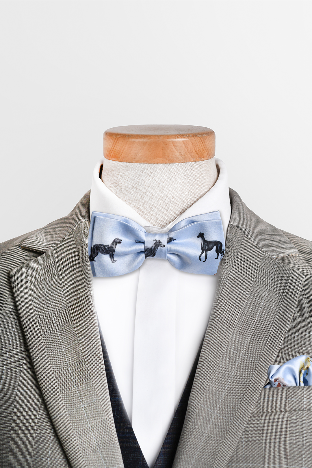 Błękitna muszka LOANI z motywem chartów. Polski projekt, wyjątkowy wzór, cztery kolory do wyboru – klasyka z artystyczną duszą.