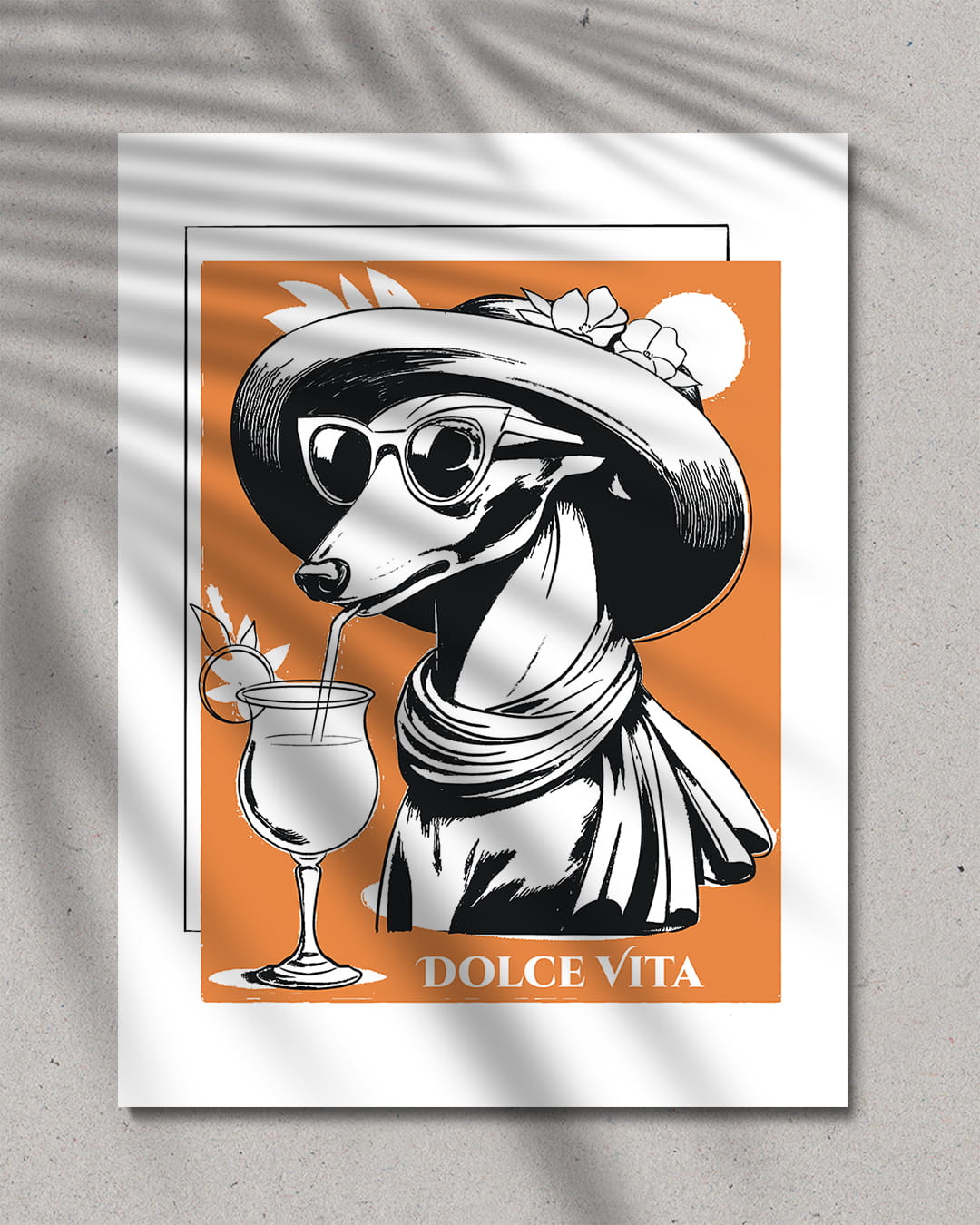 „Dolce Vita” to graficzna opowieść o chartcie w letnim kapeluszu, apaszce i z chłodnym drinkiem w łapie – wszystko w klimacie włoskiego dolce vita. To plakat, który wprowadzi do Twojego wnętrza nieco słońca, uroku i dystansu do codzienności. Idealny dla miłośników psów, ilustracji i życia w stylu slow. Ilustracja stworzona autorsko przez LOANI – z miłości do chartów, sztuki i pięknych detali.