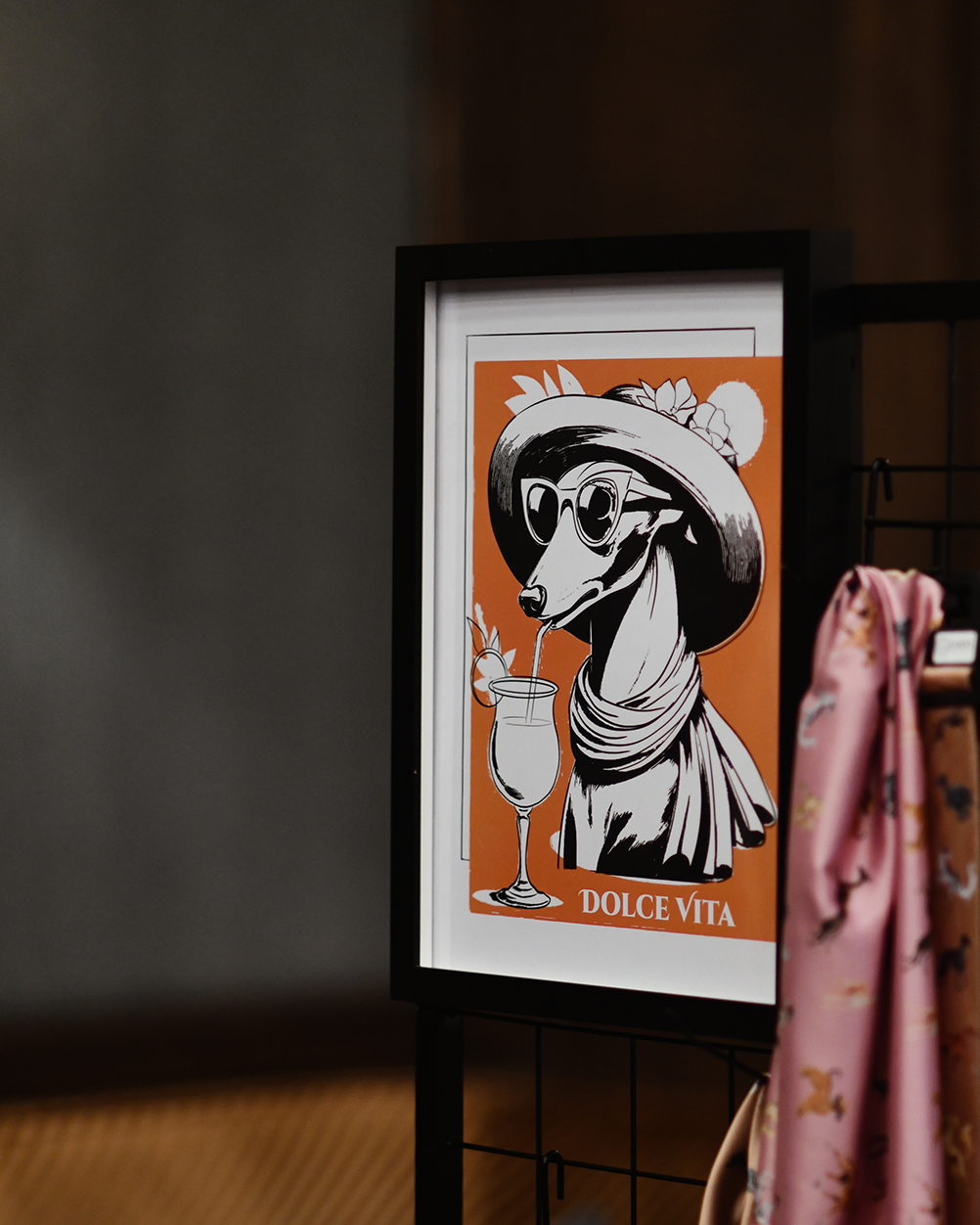 Stylowy plakat z autorską ilustracją charta w kapeluszu i apaszce, inspirowany włoskim klimatem dolce vita. Idealna dekoracja do salonu, przedpokoju lub biura – dla miłośników psów, designu i letniego luzu.