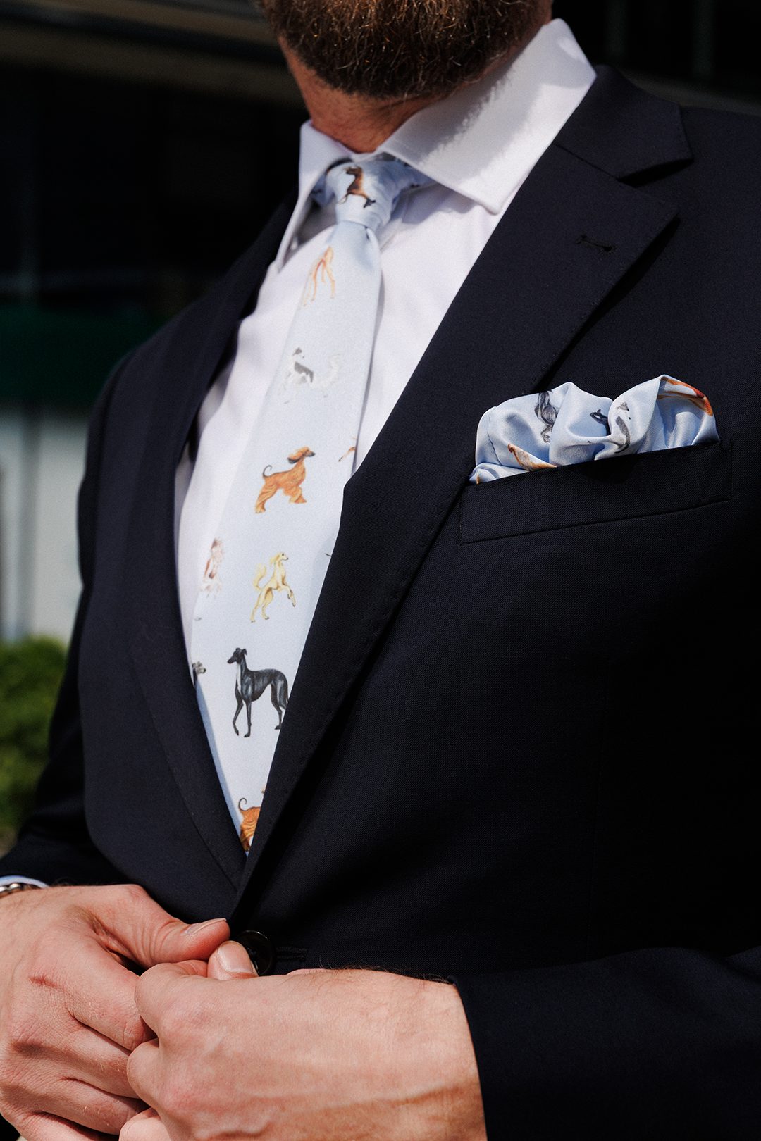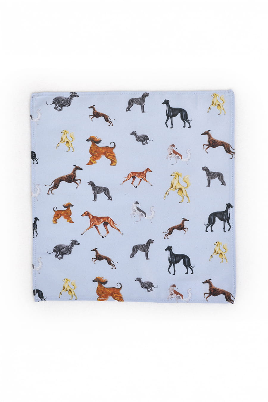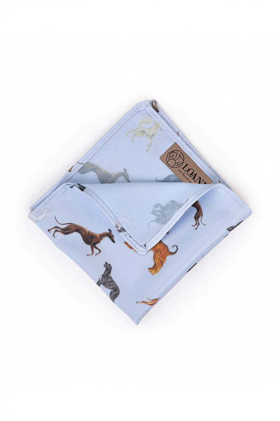 Stylowa poszetka z wzorem chartów. Kolor błękitu i autorski projekt podkreślą Twój styl na każdą okazję.