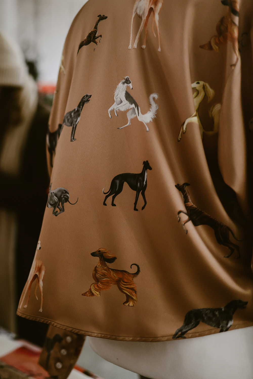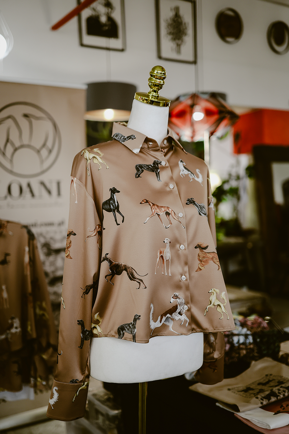 Błyszcząca, krótka koszula z lekkiej satyny z artystycznym wzorem chartów. Stylowa i wygodna – pasuje do eleganckich i codziennych stylizacji.