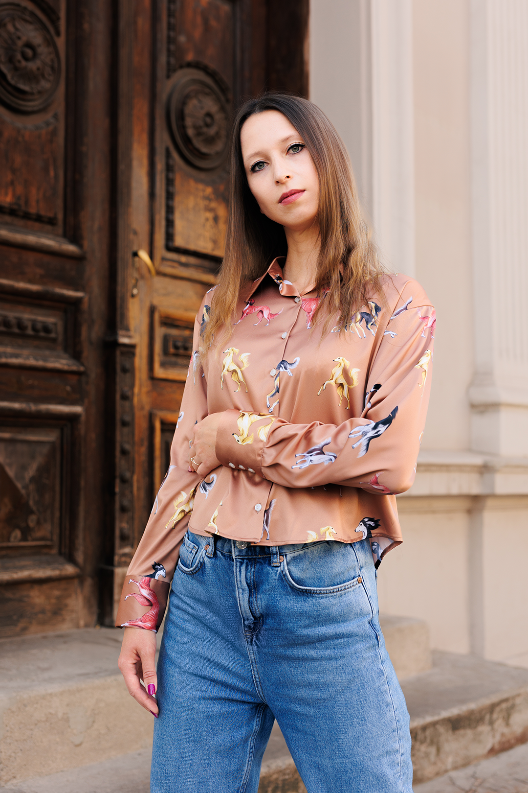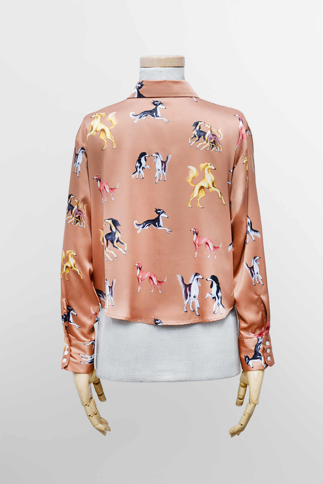 Koszulę zdobi oryginalny print z sylwetkami chartów perskich Saluki – rasy o królewskim rodowodzie, otaczanej szczególną czcią w kulturze arabskiej. Każda sylwetka psa została ręcznie narysowana przez artystkę, co czyni ten wzór absolutnie unikatowym.