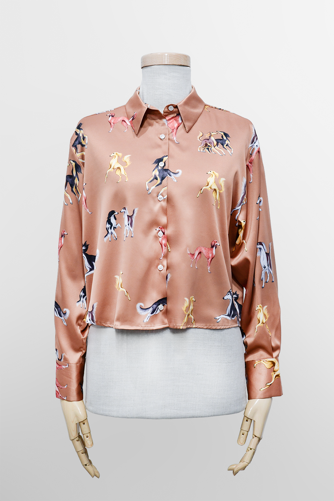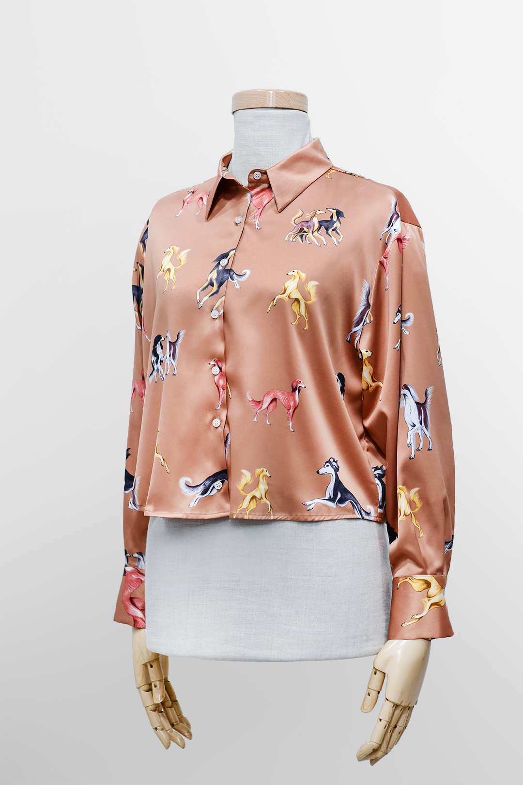 Satynowa koszula w karmelowym odcieniu z królewskim wzorem chartów Saluki – luksusowa, lekka i wyjątkowa.