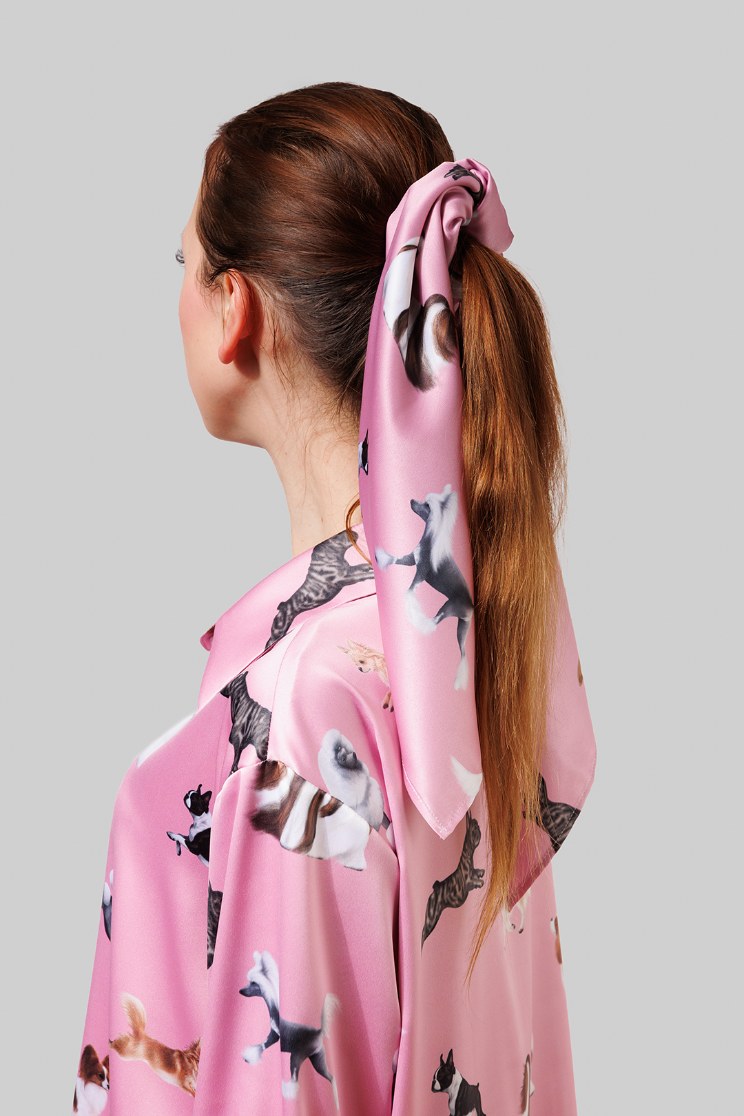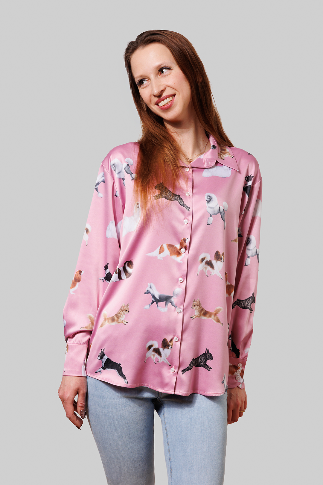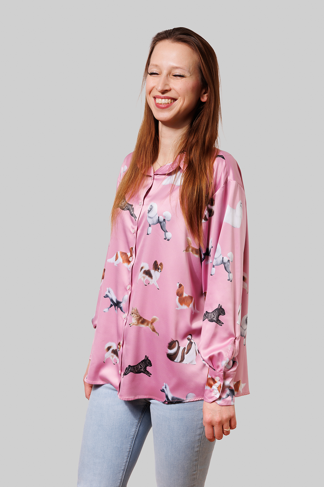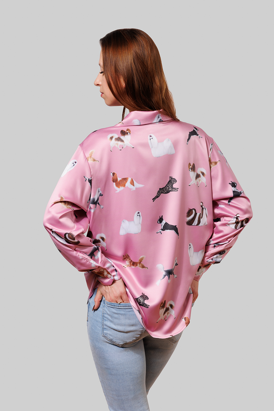 Wyjątkowa, satynowa koszula w małe pieski w kolorze różu. Wyróżnij się z tłumu i pokaż światu swoją miłość do psów.