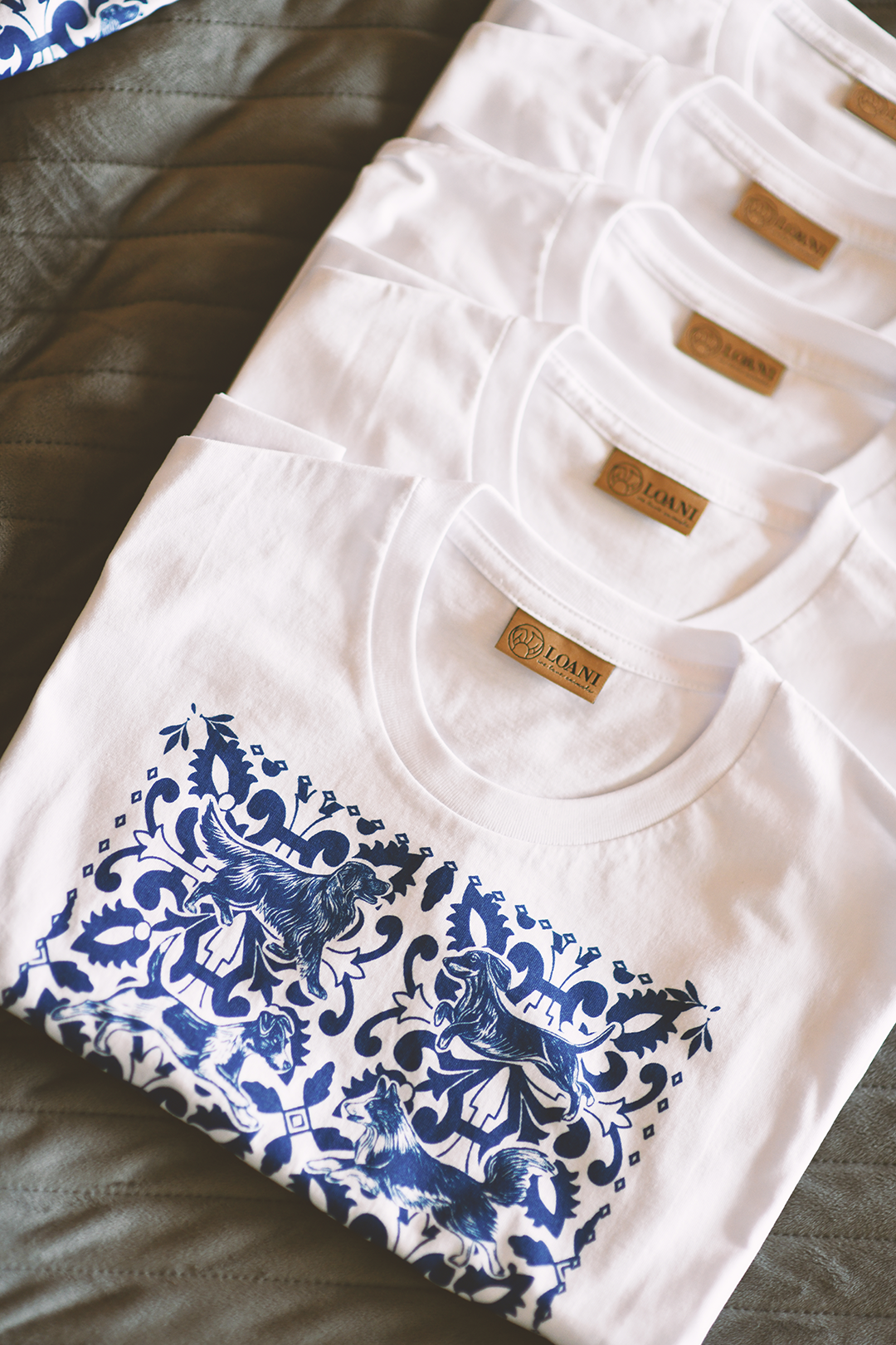 Na przodzie koszulki znajduje się granatowa grafika przedstawiająca dziesięć ręcznie rysowanych sylwetek psów różnych ras. Ich układ inspirowany portugalskimi kafelkami azulejo tworzy harmonijną, elegancką kompozycję, w której prostota spotyka się ze sztuką.