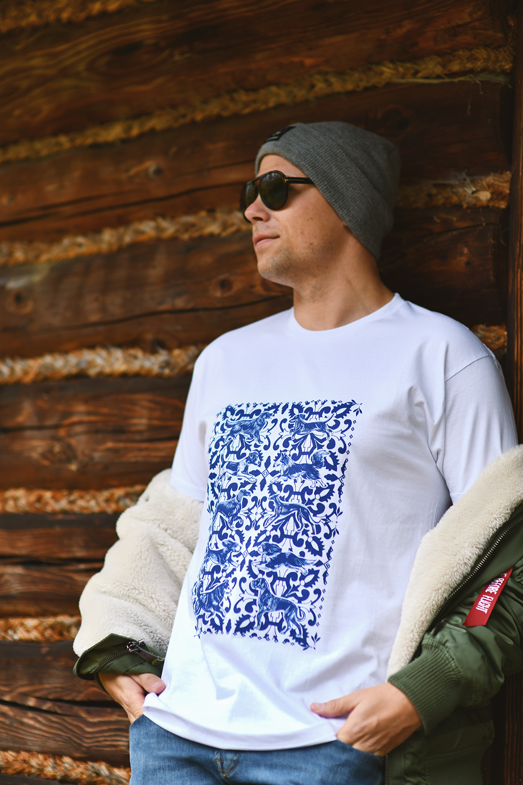 Na przodzie koszulki znajduje się granatowa grafika przedstawiająca dziesięć ręcznie rysowanych sylwetek psów różnych ras. Ich układ inspirowany portugalskimi kafelkami azulejo tworzy harmonijną, elegancką kompozycję, w której prostota spotyka się ze sztuką.