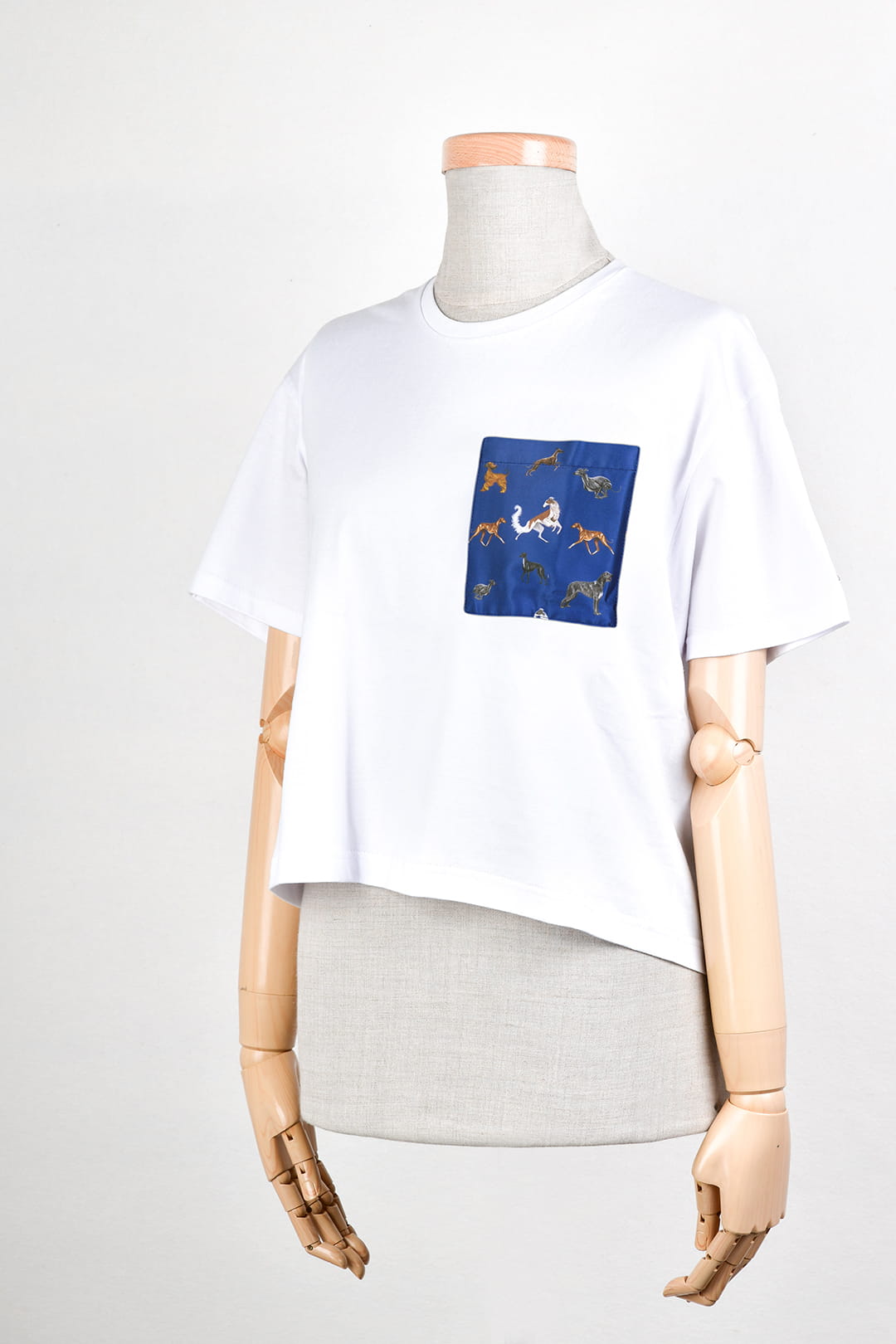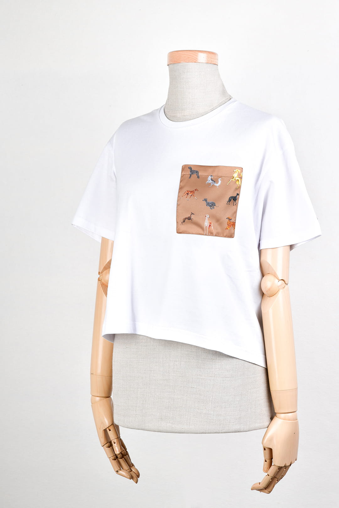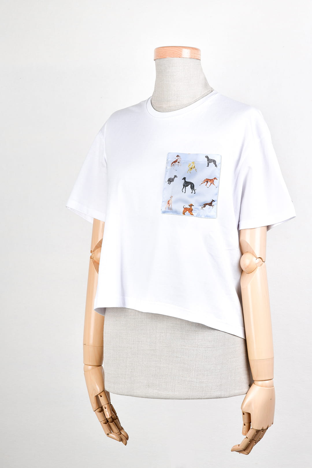 Stylowy, biały t-shirt damski z bawełny, z kieszonką ozdobioną wzorem chartów. Kieszonka w pięciu kolorach do wyboru.