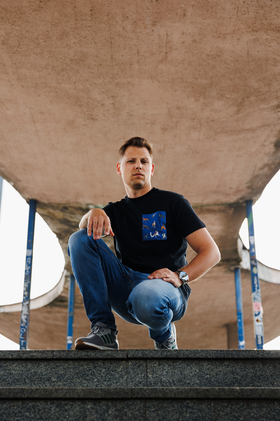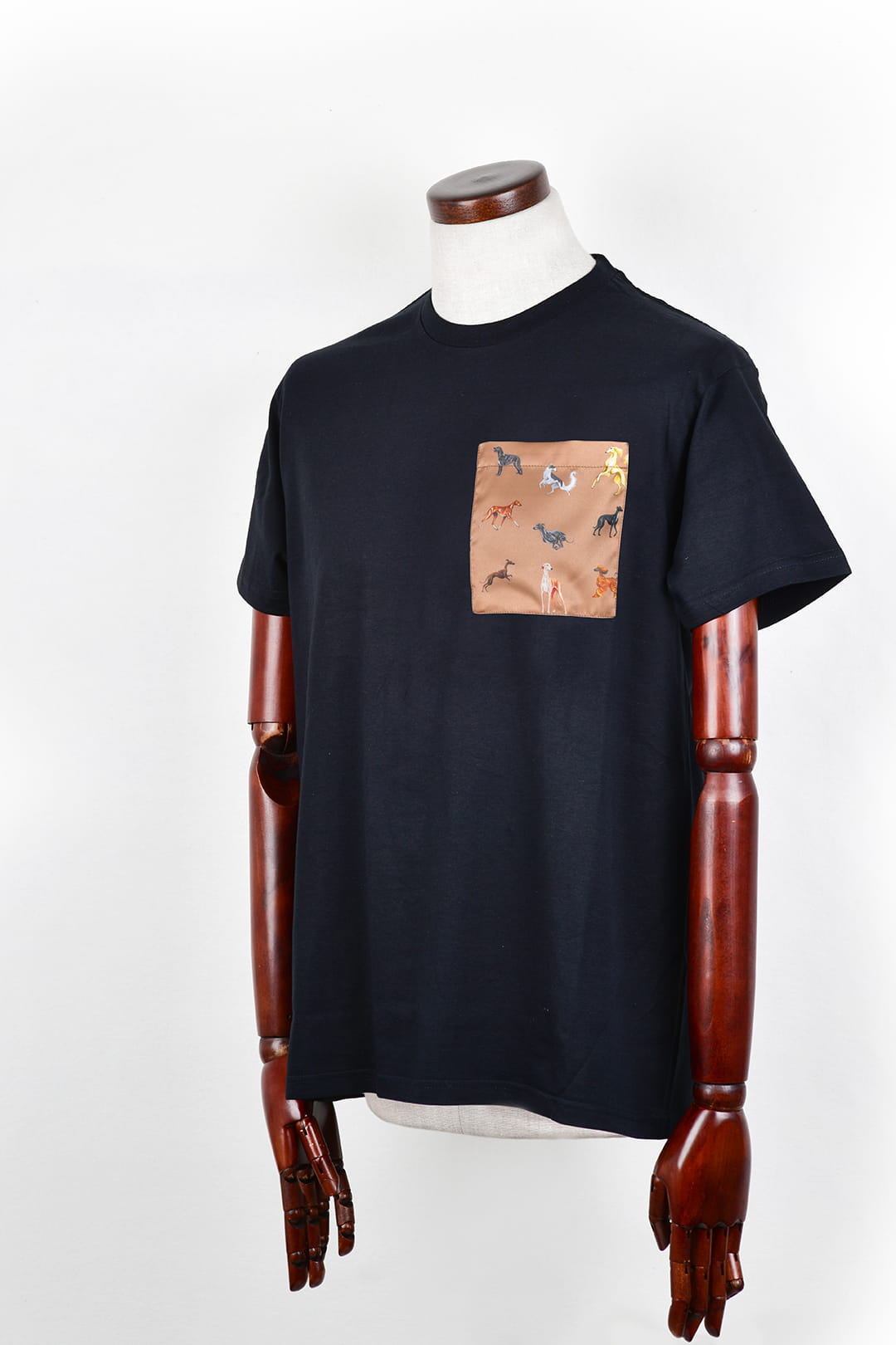 Klasyczny czarny t-shirt z artystycznym detalem – kieszonką z grafiką chartów. Wygodny i stylowy wybór na co dzień. Pięć kolorów kieszonek do wyboru.