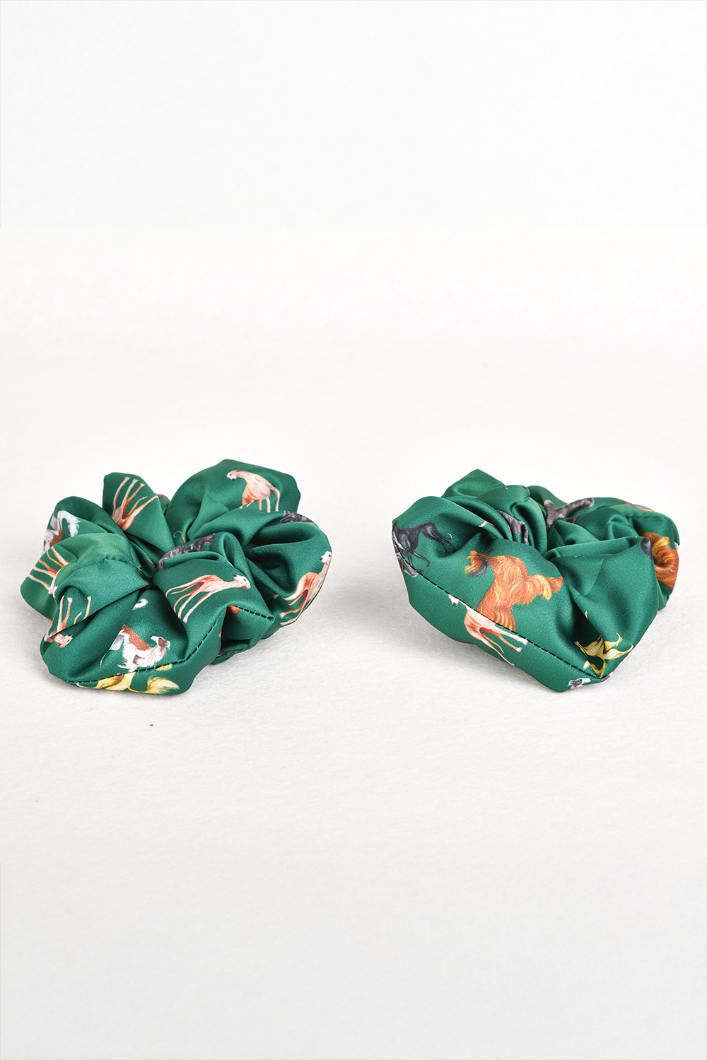 Satynowa gumka LOANI z zielonym wzorem chartów – delikatna dla włosów, ozdobna i stylowa. Pasuje do koszul i t-shirtów.